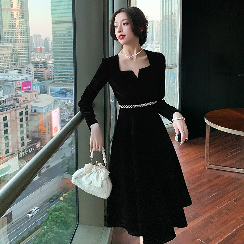 ワンピース ミモレ ミモレ丈 袖あり 長袖 スクエアネック Aライン ウエストマーク ハイウエスト ベロア ベルベット かわいい 大人可愛い きれいめ 上品 おしゃれ お洒落 レトロ フォーマル エレガント 大人 上品 主役級 存在感 クラシック 王道 ラブリー キュート ガーリー 無地 10代 20代 30代 40代 50代 60代 レディース 女性用 お出かけ パーティー イベント インスタ映え 秋 冬 二次会 2次会 お呼ばれ S M L XL 2XL 大きいサイズ 色展開 黒 ブラック | Bonny Me