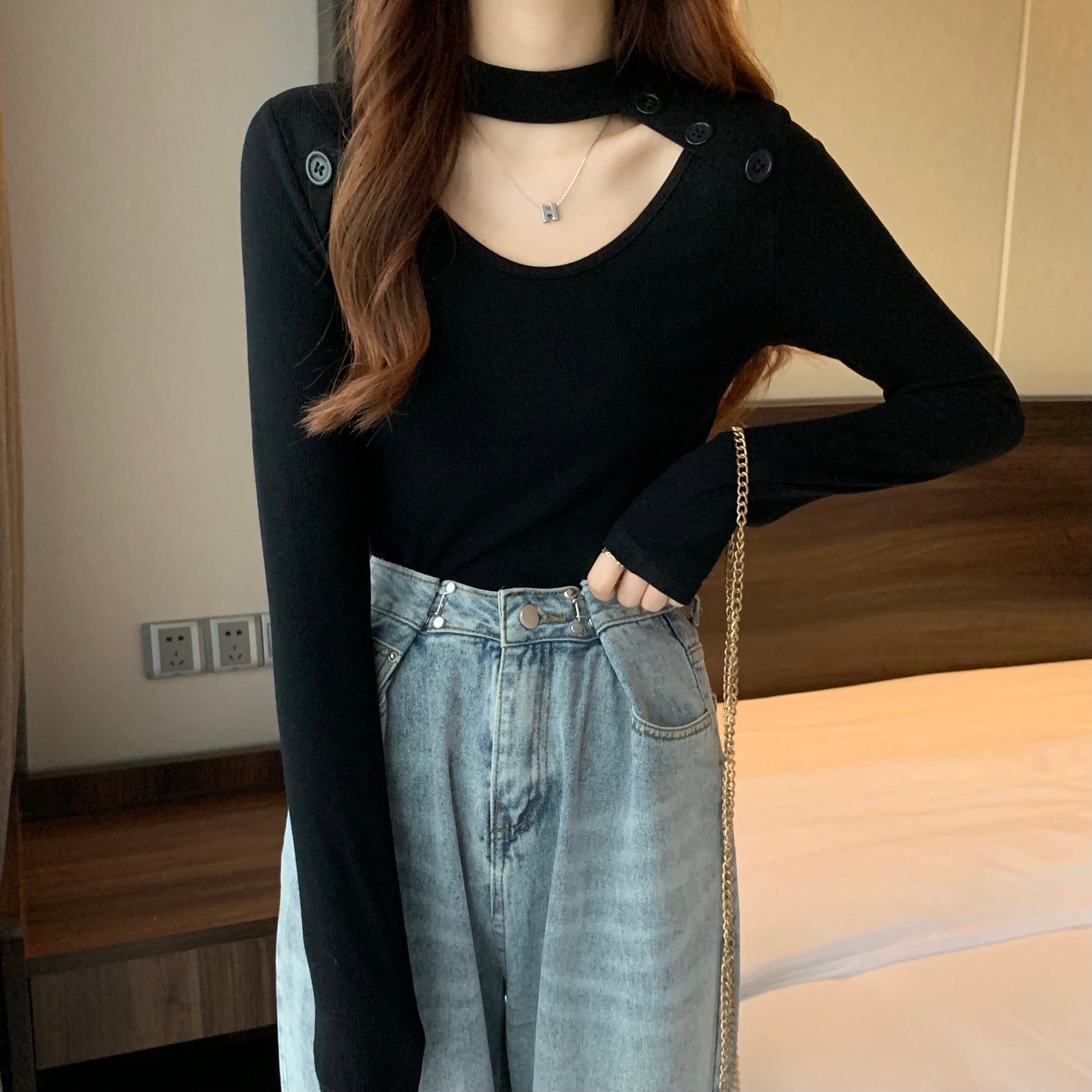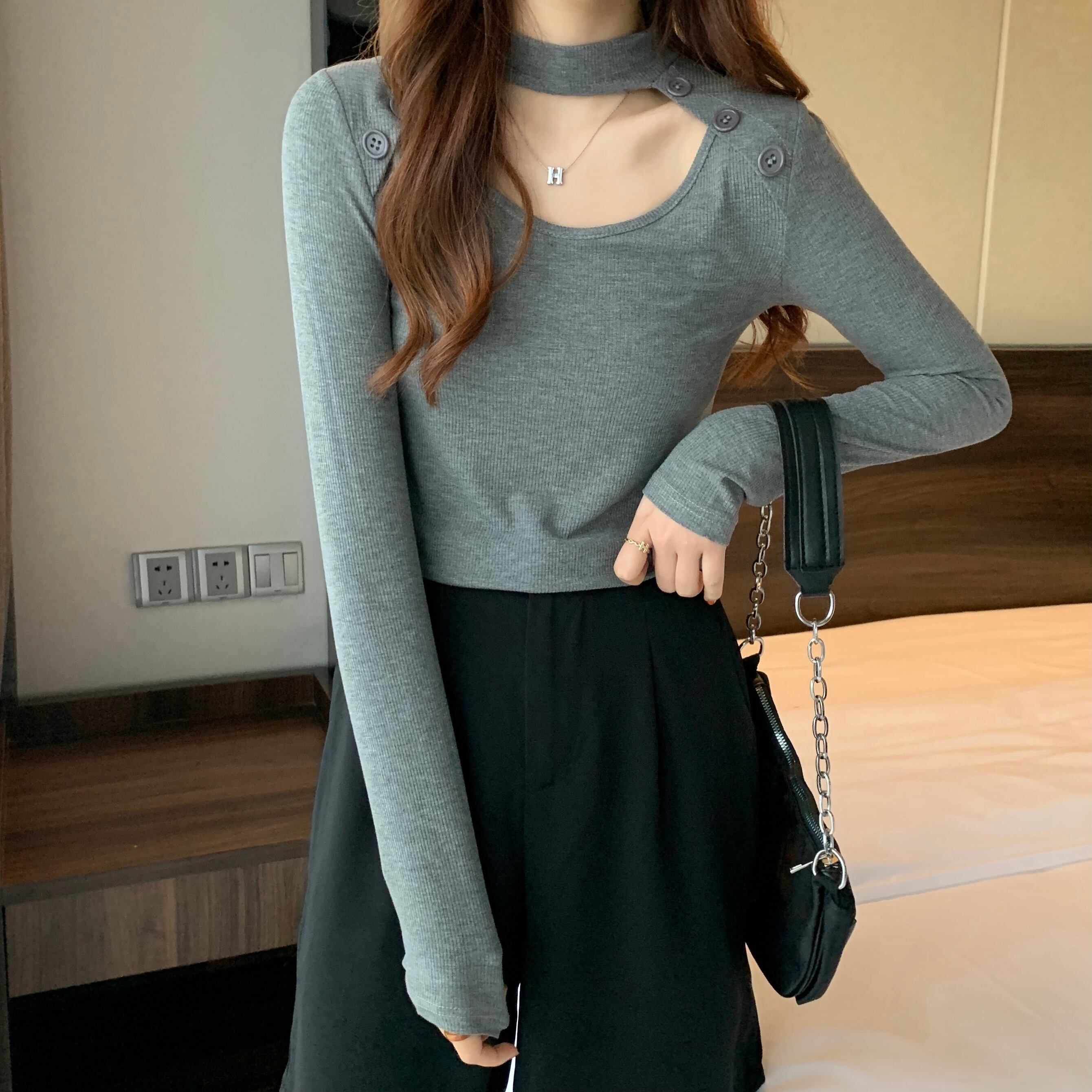 個性派 トップス シャツ ブラウス カットソー ニットソー 袖あり 長袖 ラウンドネック 襟なし タイト 伸縮性 ボタン かわいい 大人可愛い シンプル カジュアル 大人 おしゃれ お洒落 大人可愛い 大人女子 ラブリー キュート ガーリー クール モード系 セクシー 無地 春 秋 レディース 女性用 デート お出かけ 着回し 普段使い 重ね着 お揃い 双子 韓国 オルチャン M L XL 2XL 3XL 4XL 黒 ブラック 灰色 グレー デコルテ チョーカー風 胸元 ニット フィット シック 細身 | Bonny Me