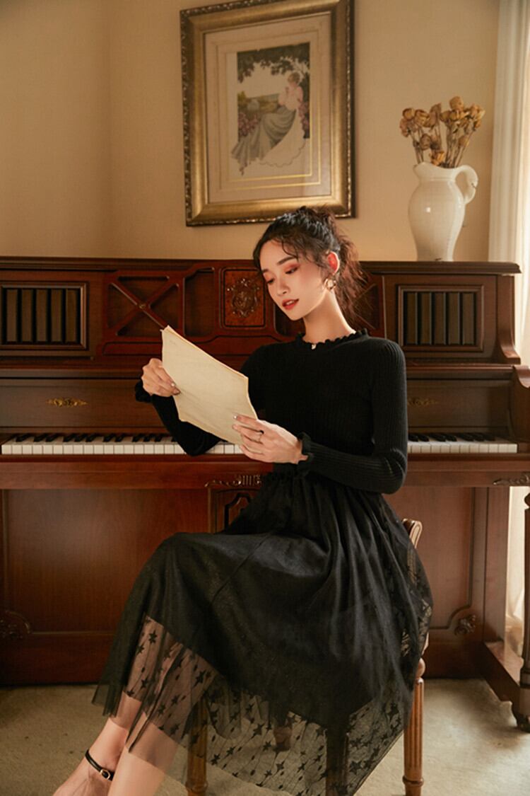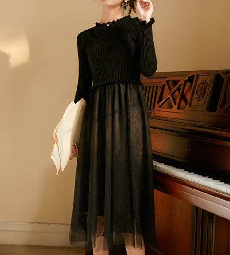 ワンピース ニットドレス フレアドレス レトロ レース ボトムセーター メッシュ ニット生地 フェアリー ハイウエスト ウェストフリル ビッグフレア ミドルロング丈 ラウンドネック フリルネック ゆったり 長袖 シック 大人女子 エレガント レディース スマート スッキリ見え カジュアル おしゃれ 好印象 韓国 細見え スマート見え キレイ見え スッキリ見え 体型カバー 華奢見え ヤセ見え サマ見え こなれ感 S M L ベージュ ブラック | Bonny Me