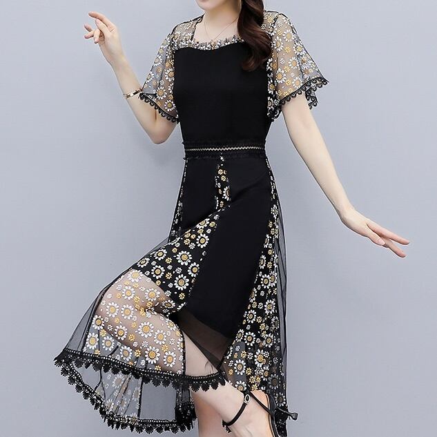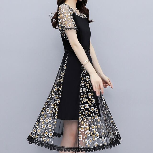 ドレス ワンピース 膝丈 ひざ丈 袖あり 半袖 スクエアネック Aライン 切り替えデザイン ドッキング フレア レース 刺繍 チュール ハイウエスト 透け感 シースルー かわいい 大人可愛い おしゃれ お洒落 レトロ ラブリー キュート ガーリー エレガント 花柄 小花柄 フラワー 10代 20代 30代 40代 50代 60代 レディース 女性用 お出かけ パーティー イベント インスタ映え 夏 お呼ばれ 3XL 4XL 5XL 大きいサイズ 色展開 白 ホワイト 黒 ブラック 黄色 イエロー | Bonny Me