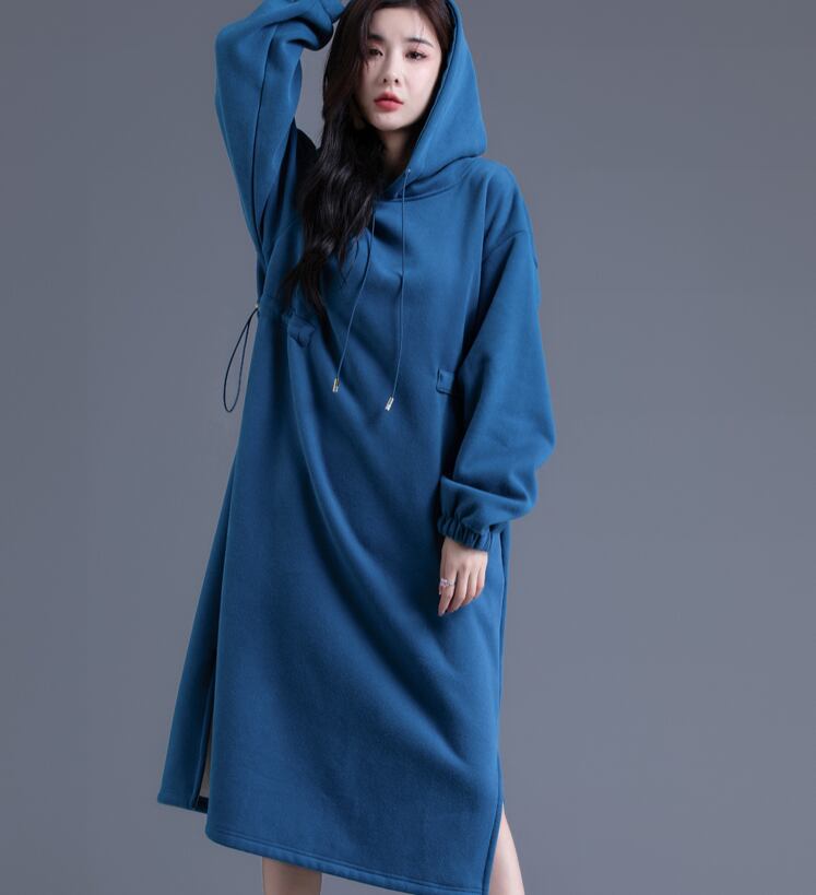 ワンピース フードドレス カジュアルドレス 長袖 ロング丈 スリット ハイウエスト 秋 冬 プラススエード フード付き ポケット ロングスカート ドロスト ガーリー デイリー 通勤 通学 普段使い 着やすい 動きやすい ゆったり 大人かわいい 若見え レディース スマート スッキリ見え ラフ カジュアル おしゃれ 好印象 韓国 細見え スマート見え キレイ見え スッキリ見え 体型カバー 華奢見え ヤセ見え サマ見え こなれ感 S M L スモッグブルー メイレッド | Bonny Me
