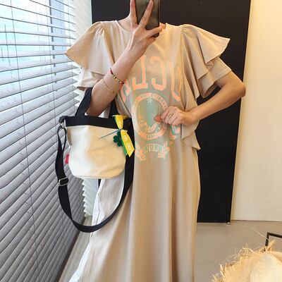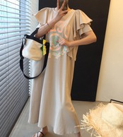 フリルのボリューム袖がかわいいTシャツワンピース。