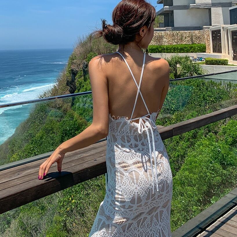 ドレス ワンピース マーメイドドレス ロング ロング丈 マキシ マキシ丈 袖なし ノースリーブ ホルターネック 細身 レース 刺繍 編み込み 透け感 シャーリング かわいい 大人可愛い おしゃれ お洒落 ラブリー キュート ガーリー エレガント レトロ セクシー スタイリッシュ 柄 10代 20代 30代 40代 50代 60代 レディース 女性用 お出かけ パーティー イベント リゾート 旅行 海 高見え 格上げ インスタ映え 夏 S M L 小さいサイズ 大きいサイズ 色展開 白 ホワイト | Bonny Me