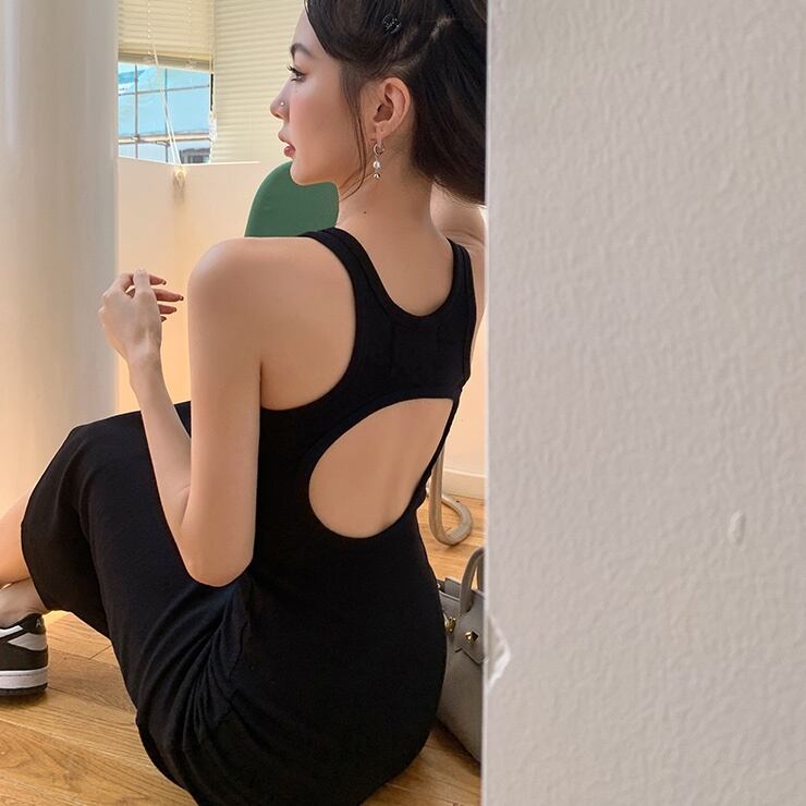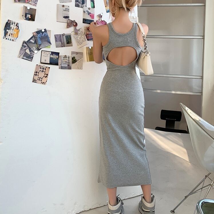 背中のカットオフデザインがセクシーなホルターネックのロングワンピース。