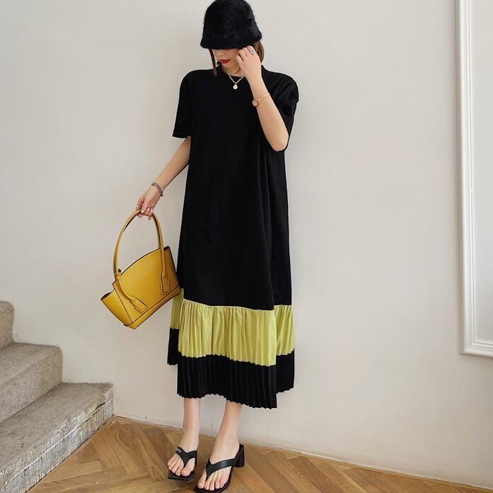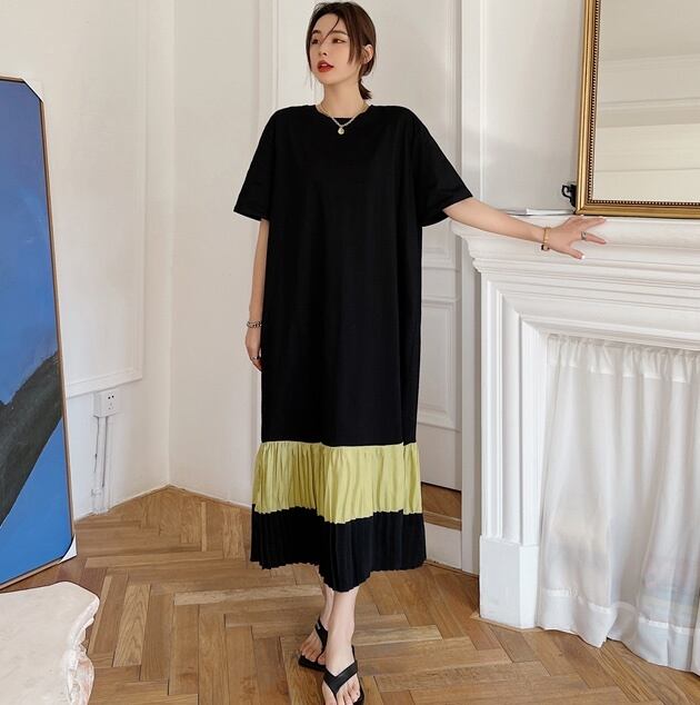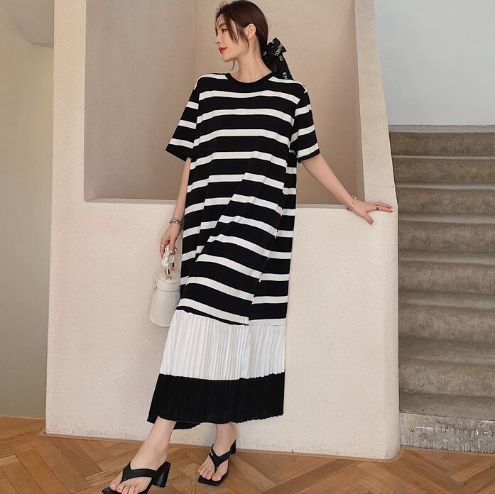 ワンピース フレアワンピース ロング ロング丈 マキシ マキシ丈 袖あり 半袖 Uネック フレア 切り替えデザイン ドッキング プリーツ かわいい 大人可愛い カジュアル おしゃれ お洒落 かっこいい レトロ ルーズ ボーダー 夏 10代 20代 30代 40代 50代 60代 レディース 女性用 ママ マタニティ お出かけ 休日 普段使い 楽ちん モテ 体形カバー インスタ映え サイズ L XL 2XL 3XL 4XL 大きいサイズ 大きめ 色展開 白 ホワイト 黒 ブラック 黄色 イエロー | Bonny Me