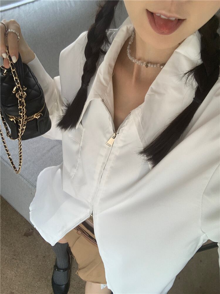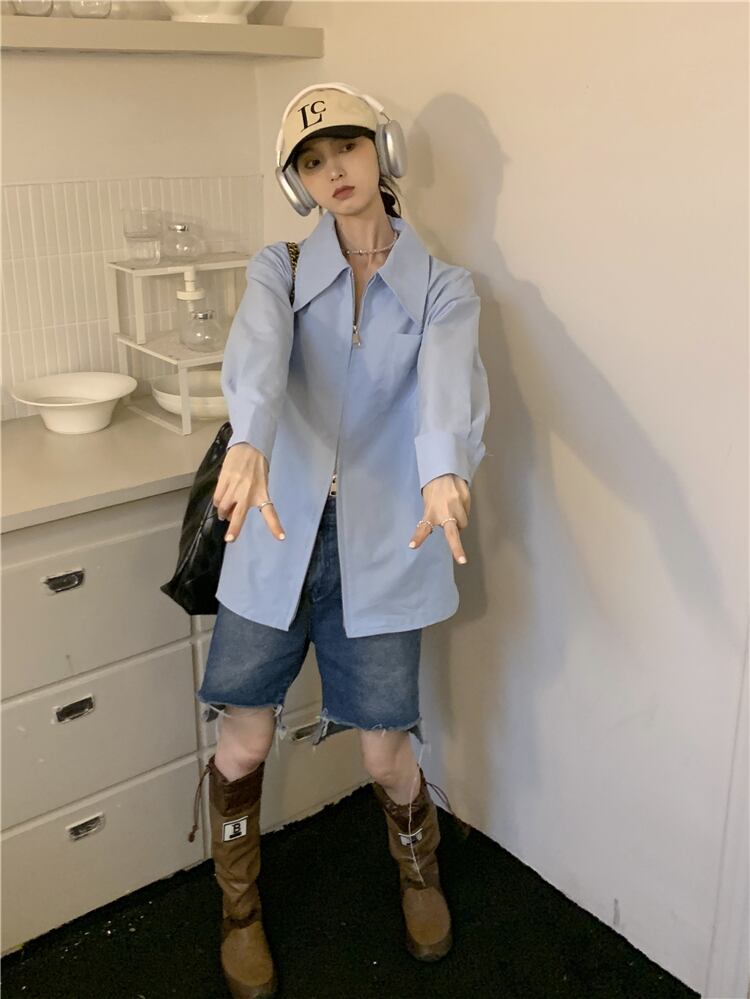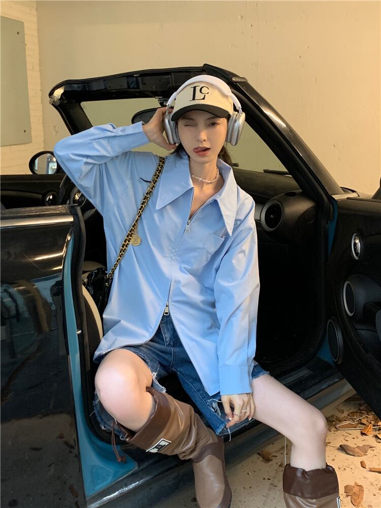 トップス シャツ ブラウス 白シャツ 白トップス 長袖 ドロップショルダー 萌袖 襟付き ワイド ファスナー ポケット 前開き かわいい 大人可愛い シンプル カジュアル おしゃれ お洒落 かっこいい 大人女子 こなれ感 ラフ 主役級 存在感 抜け感 無地 春 秋 10代 20代 30代 レディース 女性用 デート お出かけ 公園デビュー 女子会 休日 着回し 普段使い 重ね着 韓国系 オルチャン ファッション コーデ スタイル 体系カバー S M L XL ゆったり ゆる 白 ホワイト 青 ブルー | Bonny Me