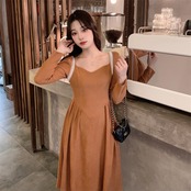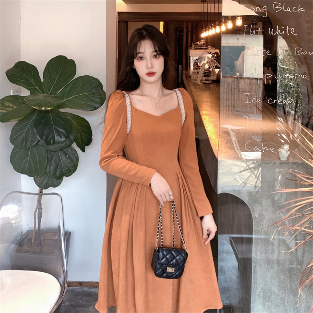 ワンピース フレアワンピース ミモレ ミモレ丈 袖あり 長袖 スクエアネック フレア Aライン ウエストマーク スパンコール かわいい 大人可愛い 上品 おしゃれ お洒落 レトロ 大人女子 ラブリー キュート ガーリー 無地 春 秋 冬 10代 20代 30代 40代 50代 60代 レディース 女性用 ママ お出かけ 休日 着回し 普段使い 重ね着 モテ インスタ映え サイズ M L XL 2XL 3XL 4XL 小さいサイズ 大きいサイズ 大きい 大きめ ビッグサイズ ゆる 色展開 茶色 ブラウン | Bonny Me