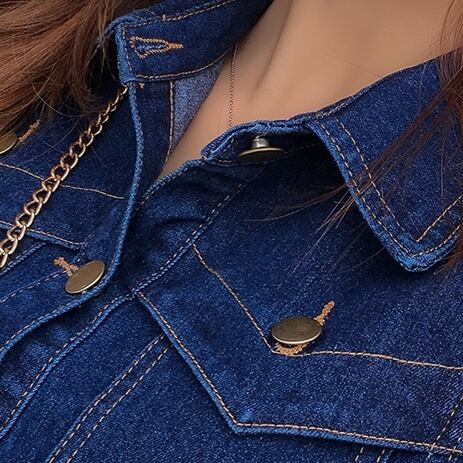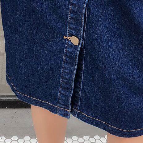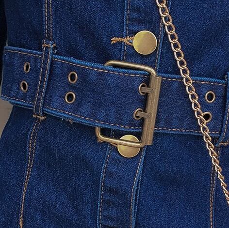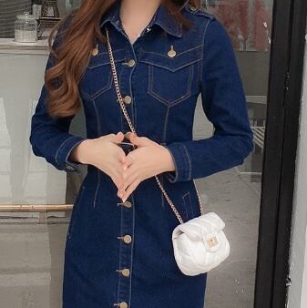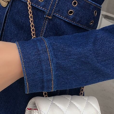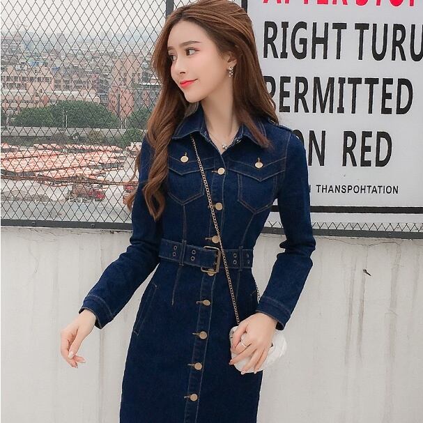 ベルト付きの膝丈デニムの長袖ワンピース。