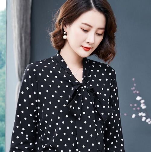 胸元リボンタイがフェミニンな水玉の長袖ブラウス。