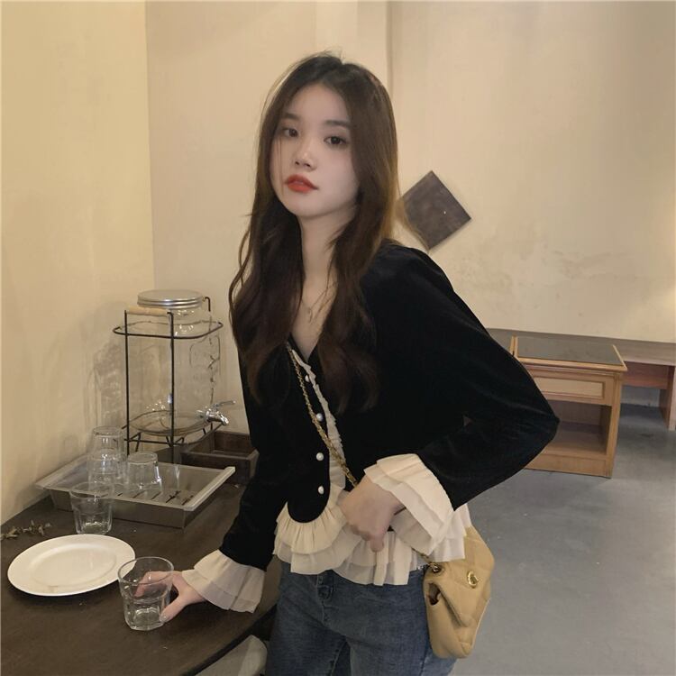 トップス シャツ ブラウス 袖あり 長袖 フレアスリーブ Vネック フリル 切り替えデザイン ドッキング かわいい 大人可愛い きれいめ シンプル おしゃれ お洒落 かっこいい レトロ 大人女子 ラブリー キュート ガーリー 個性的 クール エレガント モダン 主役級 存在感 フォーマル 無地 春 秋 冬 10代 20代 30代 40代 50代 60代 レディース 女性用 ママ お出かけ 休日 モテ インスタ映え サイズ S M L XL 2XL 小さいサイズ 大きいサイズ 色展開 黒 ブラック | Bonny Me