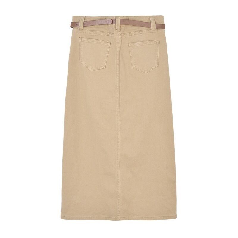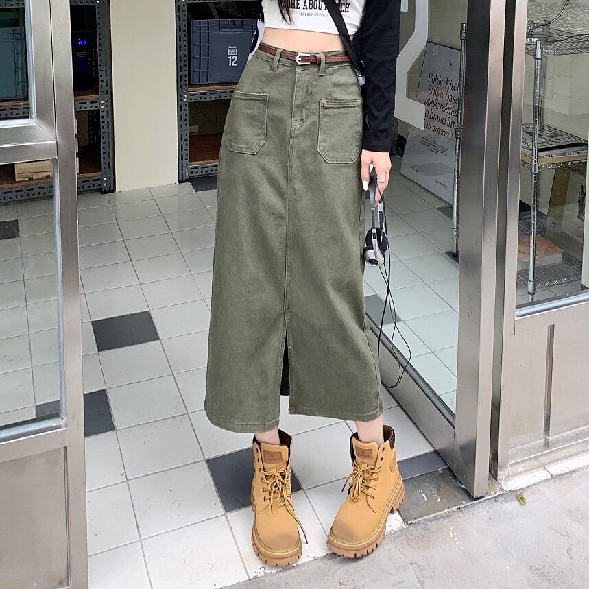 スカート デニムスカート ハイウエスト スリム ミドル丈 新作 春 スリット カジュアル ヴィンテージ Aライン ストレート 無地 レディース ファッショナブル シック ポケット 大人っぽい エレガント 好印象 モテコーデ おしゃれ 10代 20代 30代 大人かわいい 韓国 OL 学生 スッキリ見え 休日 着回し スマート見え キレイ見え 足長見え 足長効果 細見え 体型カバー 華奢見え ヤセ見え サマ見え こなれ感 S M L XL カーキ グリーン | Bonny Me