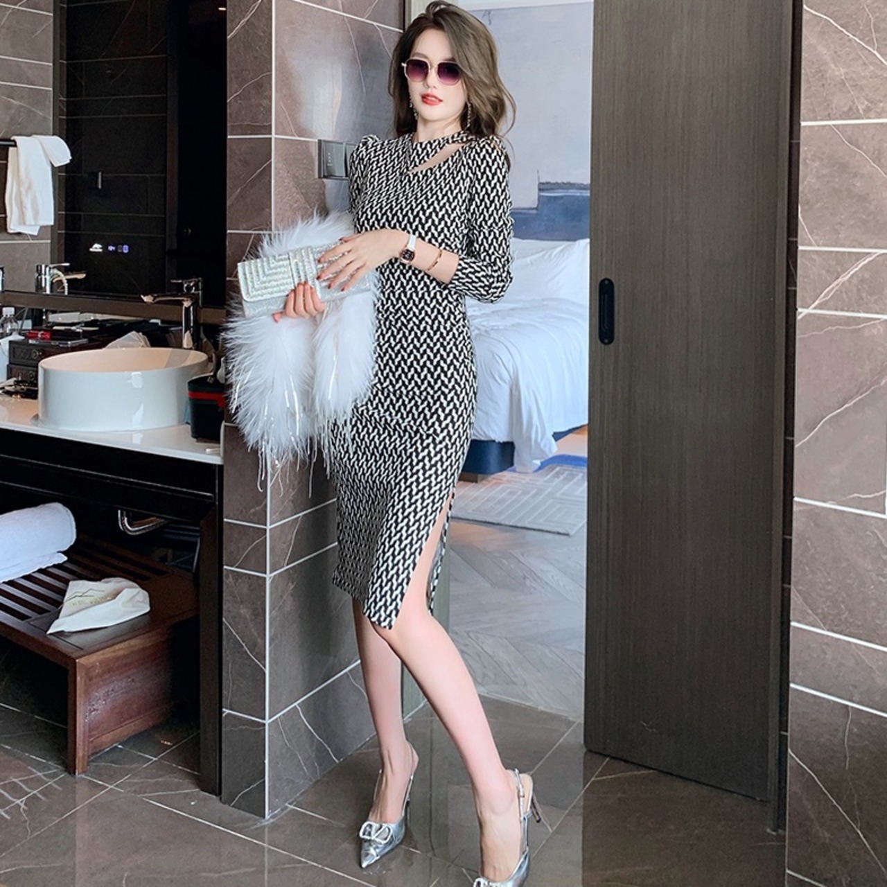 ワンピース 膝丈 ひざ丈 袖あり 7分袖 七分袖 長袖 ラウンドネック スリム タイト 細身 スリット サイドスリット かわいい 大人可愛い おしゃれ お洒落 かっこいい レトロ 個性的 クール セクシー 主役級 存在感 柄 春 秋 10代 20代 30代 40代 50代 60代 レディース 女性用 ママ デート お出かけ 女子会 休日 パーティー イベント モテ 穴あき トレンド 流行 インスタ映え サイズ M L 小さいサイズ 大きいサイズ 色展開 白 ホワイト 黒 ブラック モノトーン | Bonny Me