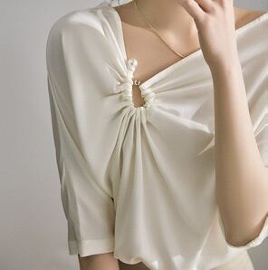 襟のアシンメトリーデザインがお洒落な五分袖カットソー。