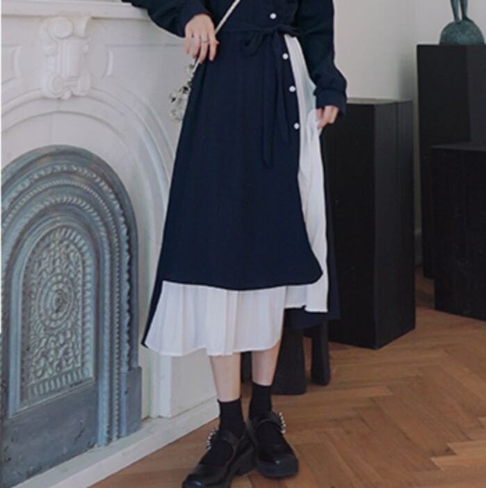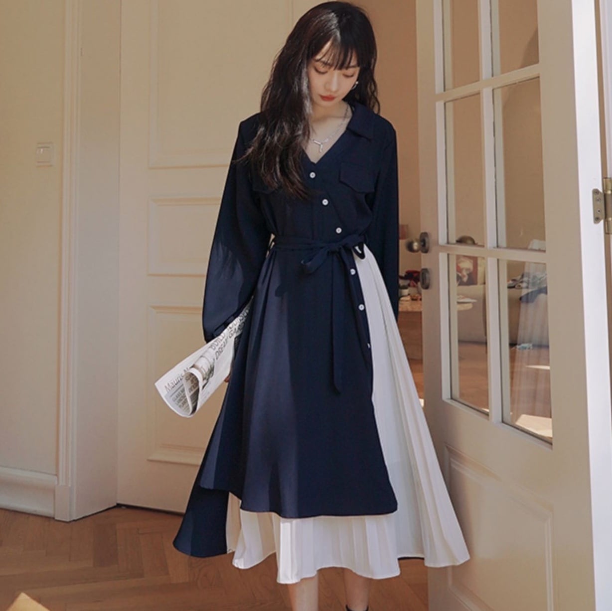 ワンピース シャツワンピース フレアワンピース ミモレ ミモレ丈 ロング ロング丈 袖あり 長袖 Vネック 襟付き アシンメトリー 切り替えデザイン ドッキング シフォン ウエストマーク ウエストリボン かわいい 大人可愛い きれいめ 上品 おしゃれ お洒落 かっこいい 大人女子 こなれ感 無地 春 秋 10代 20代 30代 40代 50代 60代 レディース 女性用 ママ お出かけ 休日 着回し 普段使い モテ インスタ映え サイズ S M L XL 小さいサイズ 大きいサイズ 色展開 青 ブルー | Bonny Me