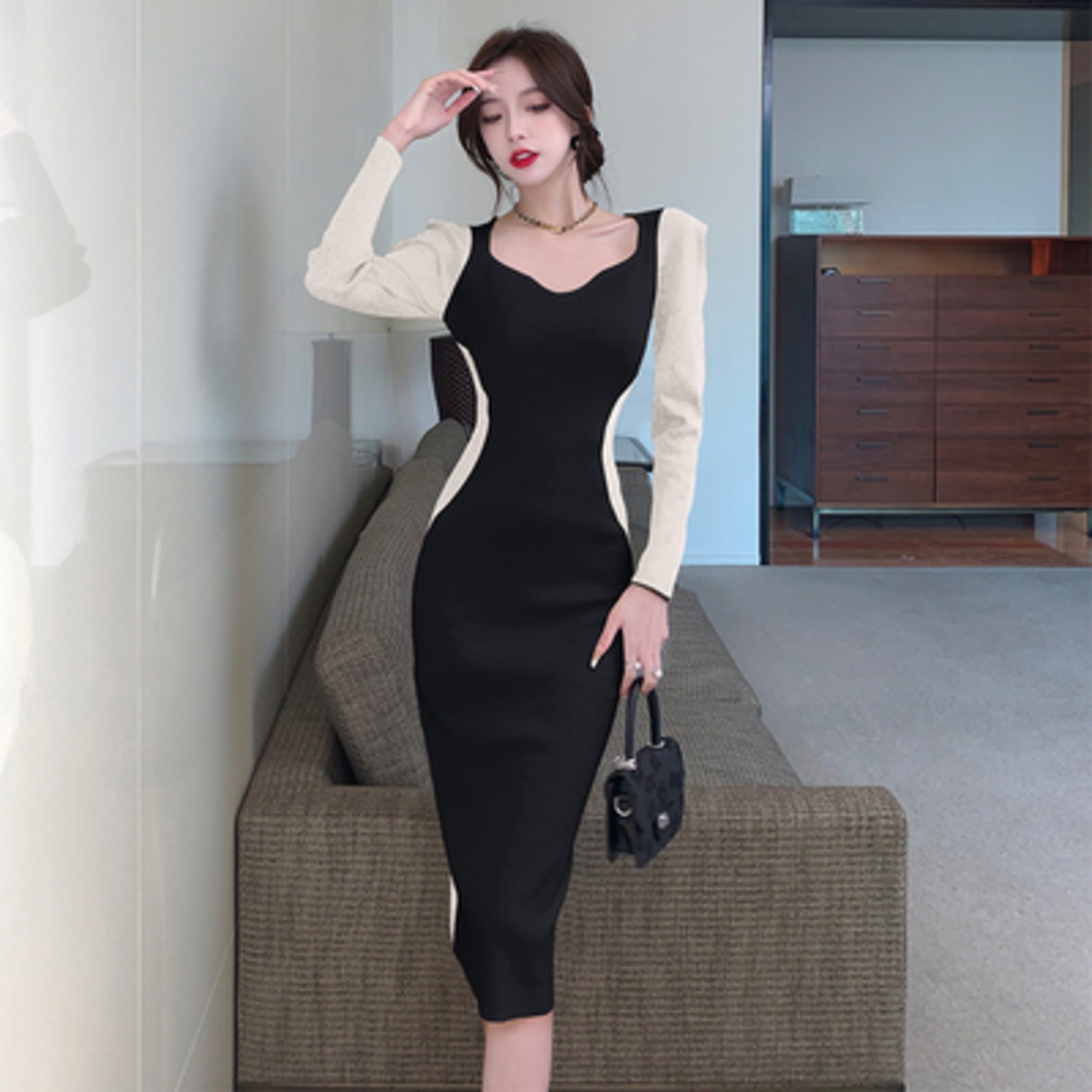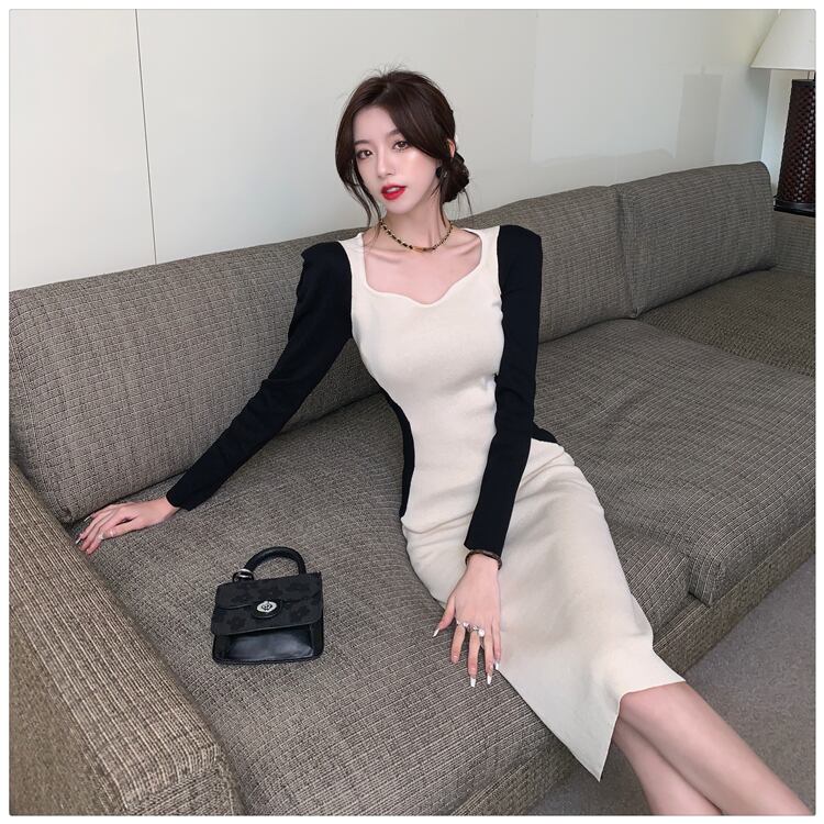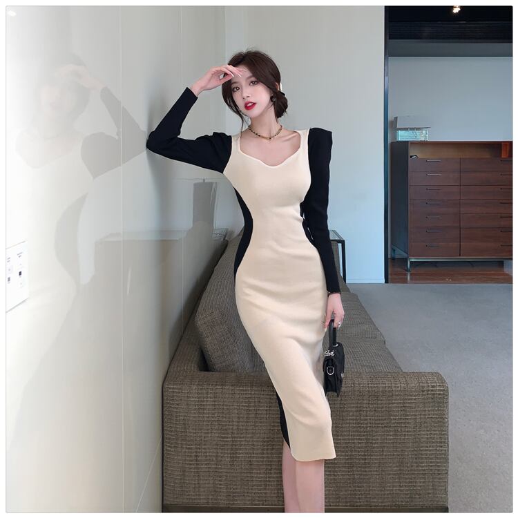 ワンピース 膝丈 ひざ丈 膝下 袖あり 長袖 スクエアネック スリム タイト 細身 切り替えデザイン 伸縮性 かわいい 大人可愛い おしゃれ お洒落 かっこいい 個性的 クール モード系 セクシー モダン 無地 春 秋 10代 20代 30代 40代 50代 60代 レディース 女性用 ママ お出かけ 休日 イベント 着回し 普段使い 重ね着 お揃い 双子 モテ インスタ映え サイズ S M L 小さいサイズ 大きいサイズ 色展開 白 ホワイト 黒 ブラック バイカラー モノトーン カラバリ | Bonny Me