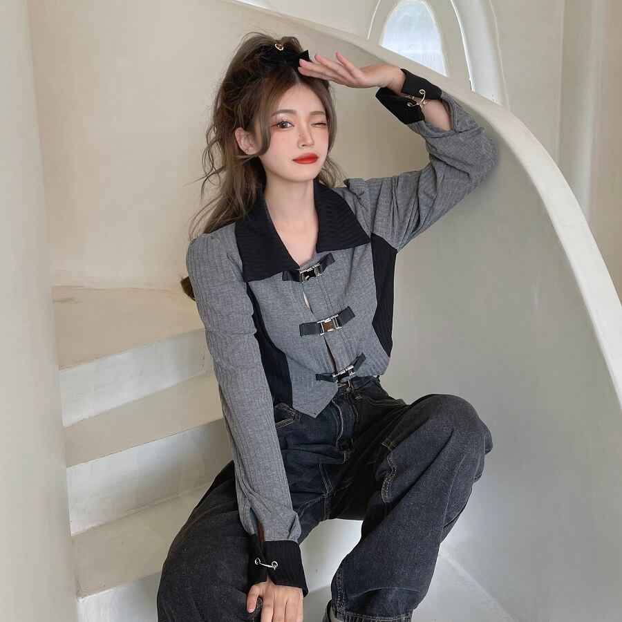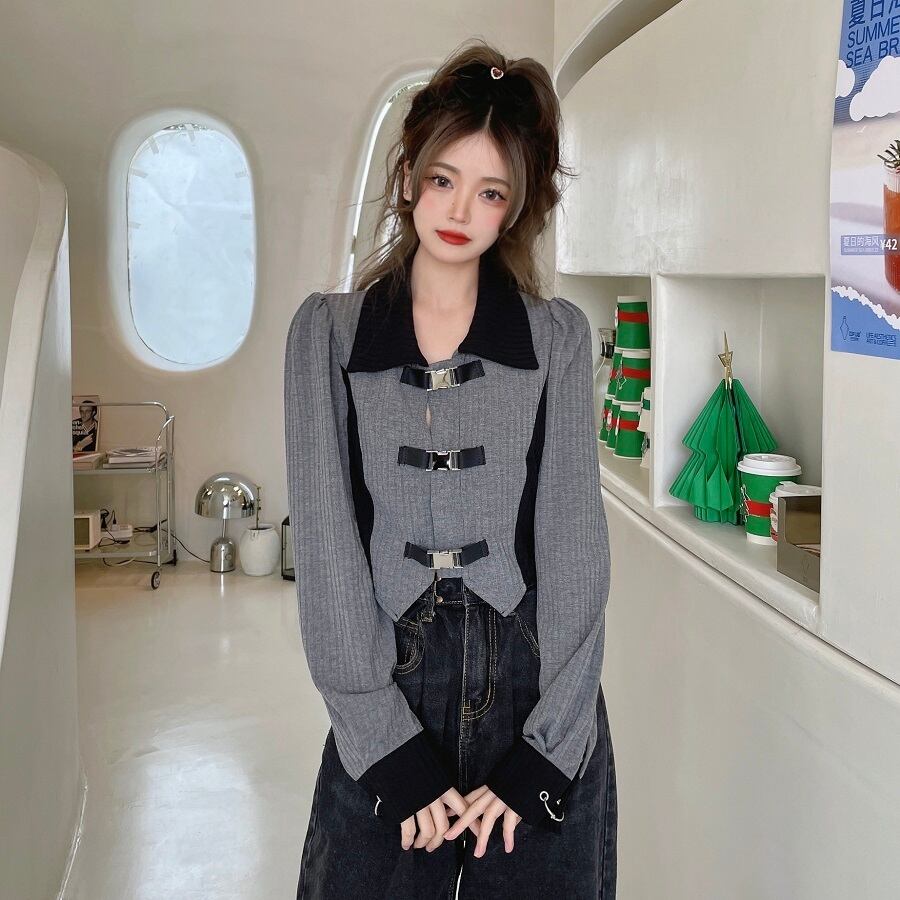 ジャケット トップス トップ パフスリーブ 長袖 シャツ ポロカラー フランス ヴィンテージ ゆったり スウィート クールスタイル コントラスト レディース 春 デザインセンス トレンド バイカラー カジュアル ショート丈 女子会 通勤 通学 OL 学生 おしゃれ スッキリ見え 休日 10代 20代 韓国 スマート見え キレイ見え 足長見え 足長効果 細見え 体型カバー 華奢見え ヤセ見え サマ見え こなれ感 M L グレー | Bonny Me