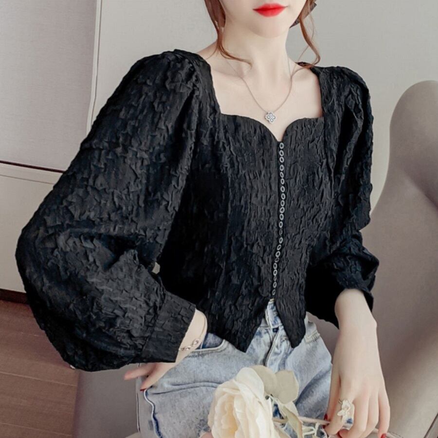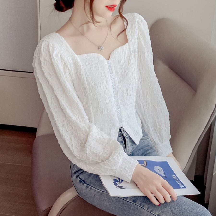 トップス シック 夏 ロマンチック パフスリーブフランス風 スリムフィットプルオーバーボタン地模様 セクシー 長袖 スクエアネック スウィート レディース カジュアル きれいめ エレガント 女子力 大人かわいい 女子会 通勤 通学 OL 学生 おしゃれ スッキリ見え 休日 10代 20代 韓国 スマート見え キレイ見え 足長見え 足長効果 細見え 体型カバー 華奢見え ヤセ見え サマ見え こなれ感 S M L XL ホワイト ブラック | Bonny Me