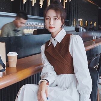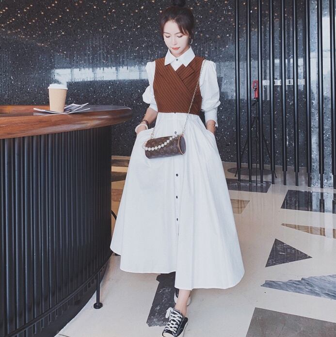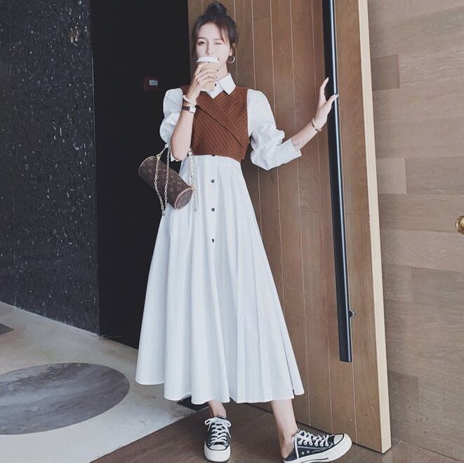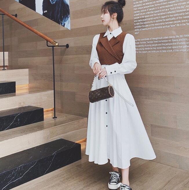 ベストが付いたお洒落なシャツロングワンピース。