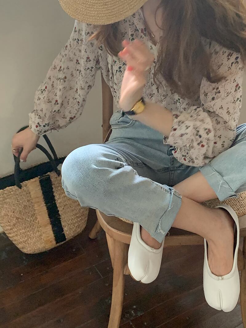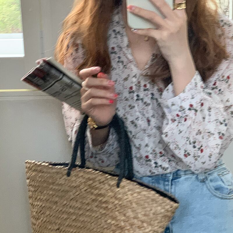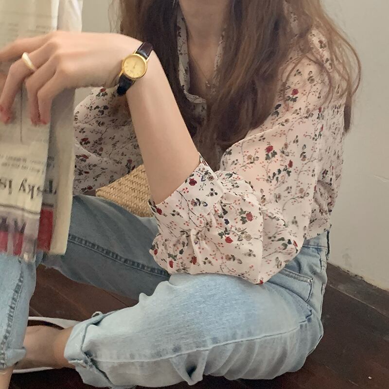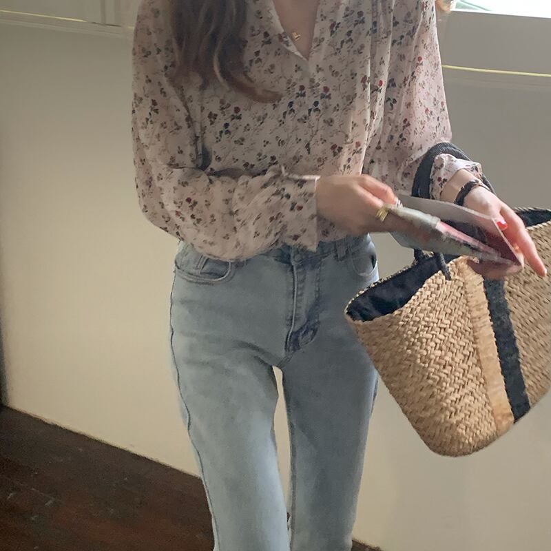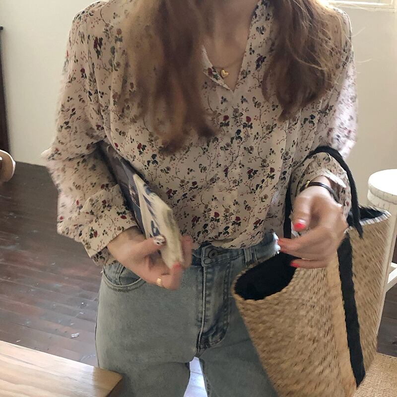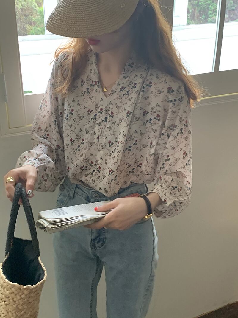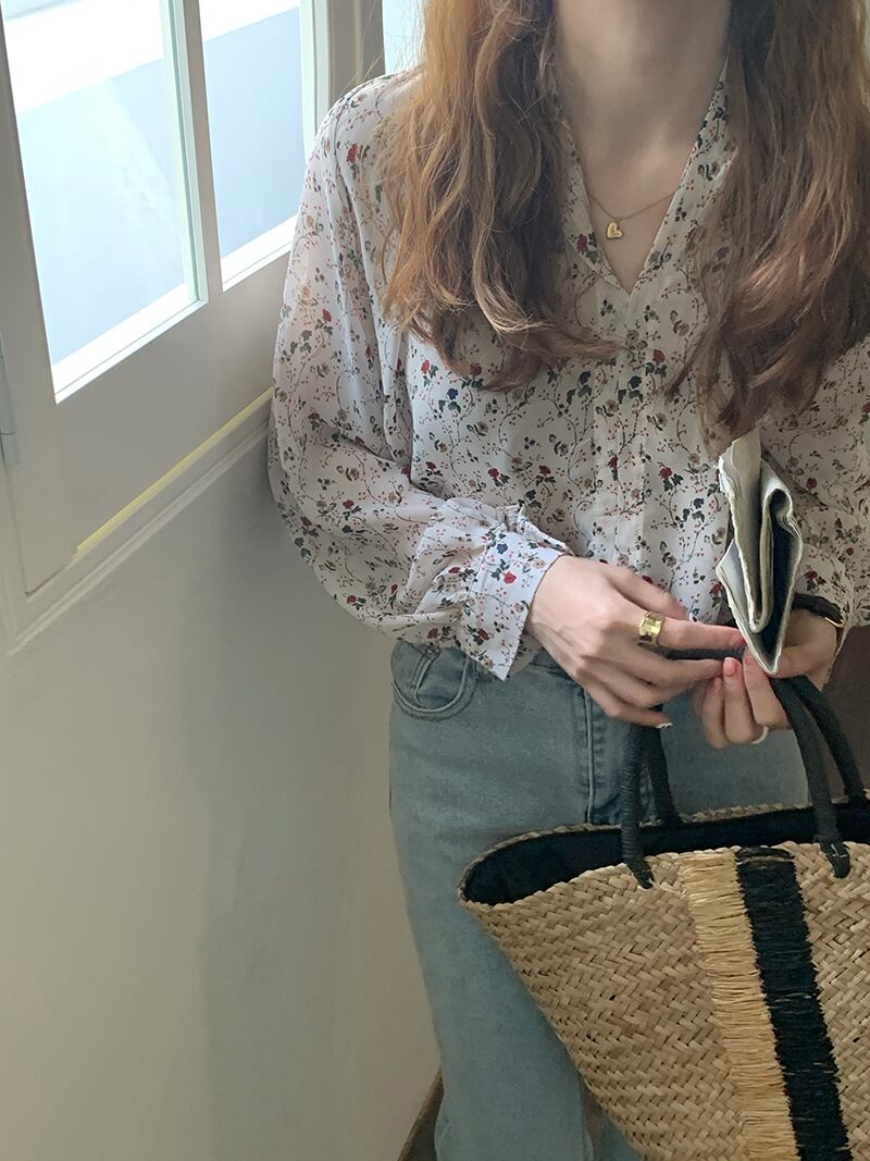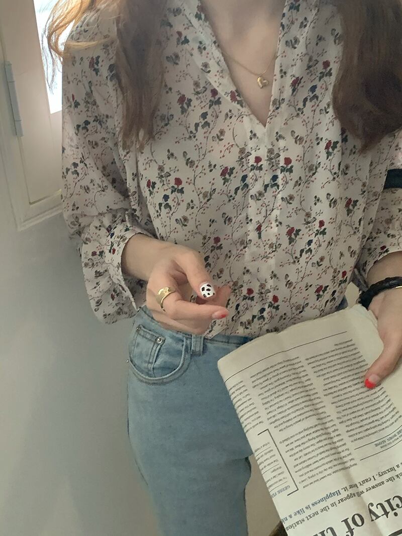 トップス シャツ ブラウス プルオーバー 白シャツ 白トップス 長袖 Vネック シフォン かわいい 大人可愛い シンプル カジュアル おしゃれ お洒落 大人女子 こなれ感 ラフ 主役級 存在感 抜け感 柄 花柄 小花柄 フラワー 春 秋 10代 20代 30代 40代 レディース 女性用 デート お出かけ 女子会 休日 リゾート 旅行 高原 ホテル レストラン 着回し 普段使い 重ね着 韓国系 オルチャン ファッション コーデ スタイル モテ 体系カバー プレゼント ギフト フリーサイズ 白 ホワイト | Bonny Me
