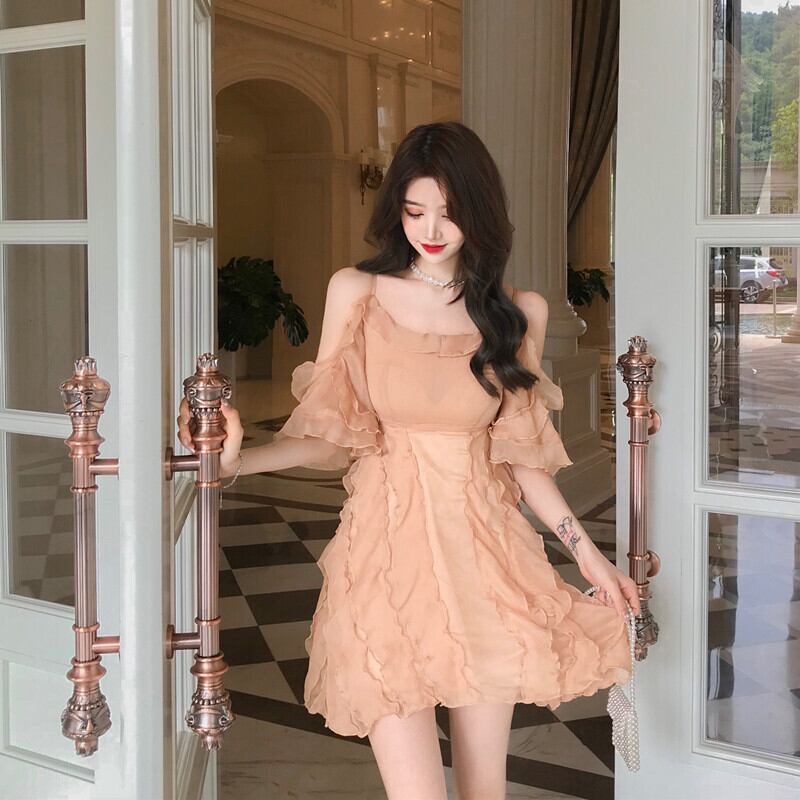 オフショルデザインがセクシーでガーリーなショート丈ワンピース。