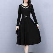 ワンピース ラージサイズ 新作 春秋冬 厚手 Vネック メッシュレース Vライン ベルト メタルバックル 長袖 ミディスカート 無地 Aラインスカート エレガント ファスナー韓国 フレアスカート 細見え 足長見え スタイルUP カジュアル 20代 30代 OL 学生 通勤 通学 おしゃれ スッキリ見え スマート見え キレイ見え 足長見え 足長効果 細見え 体型カバー 華奢見え ヤセ見え サマ見え こなれ感 L XL 2XL 3XL 4XL 5XL ブラック | Bonny Me