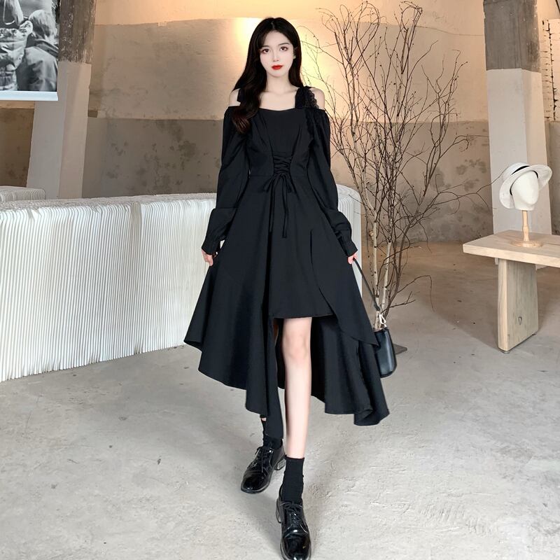 ワンピース ドレス アシンメトリー イレギュラースカート オフショルダー ハイウェスト パフスリーブ ファスナー レース ストラップ ビッグサイズ 長袖 セクシーエレガント 無地 ゆったり 新作 秋 リボン 細見え 20代 30代 おしゃれ スッキリ見え モテコーデ 韓国 スマート見え キレイ見え 足長見え 足長効果 細見え 体型カバー 華奢見え ヤセ見え サマ見え こなれ感 M L XL 2XL 3XL 4XL ブラック